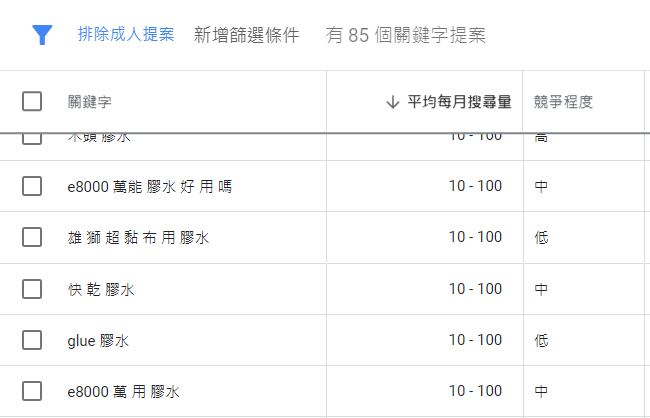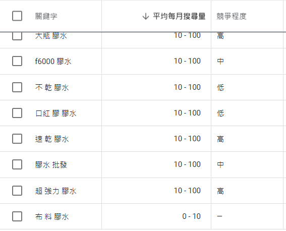 雖然膠水的競爭為”中等”,不過膠水的搜尋量還是位居第一(1000~10000)