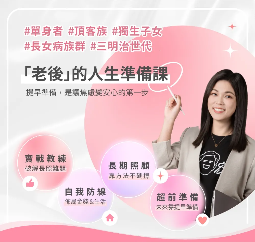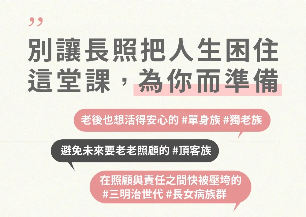 本課程提供實戰解方,教您算清楚長照花費、掌握政府補助,讓您在未來擁有選擇住哪裡、要誰照顧的自由。