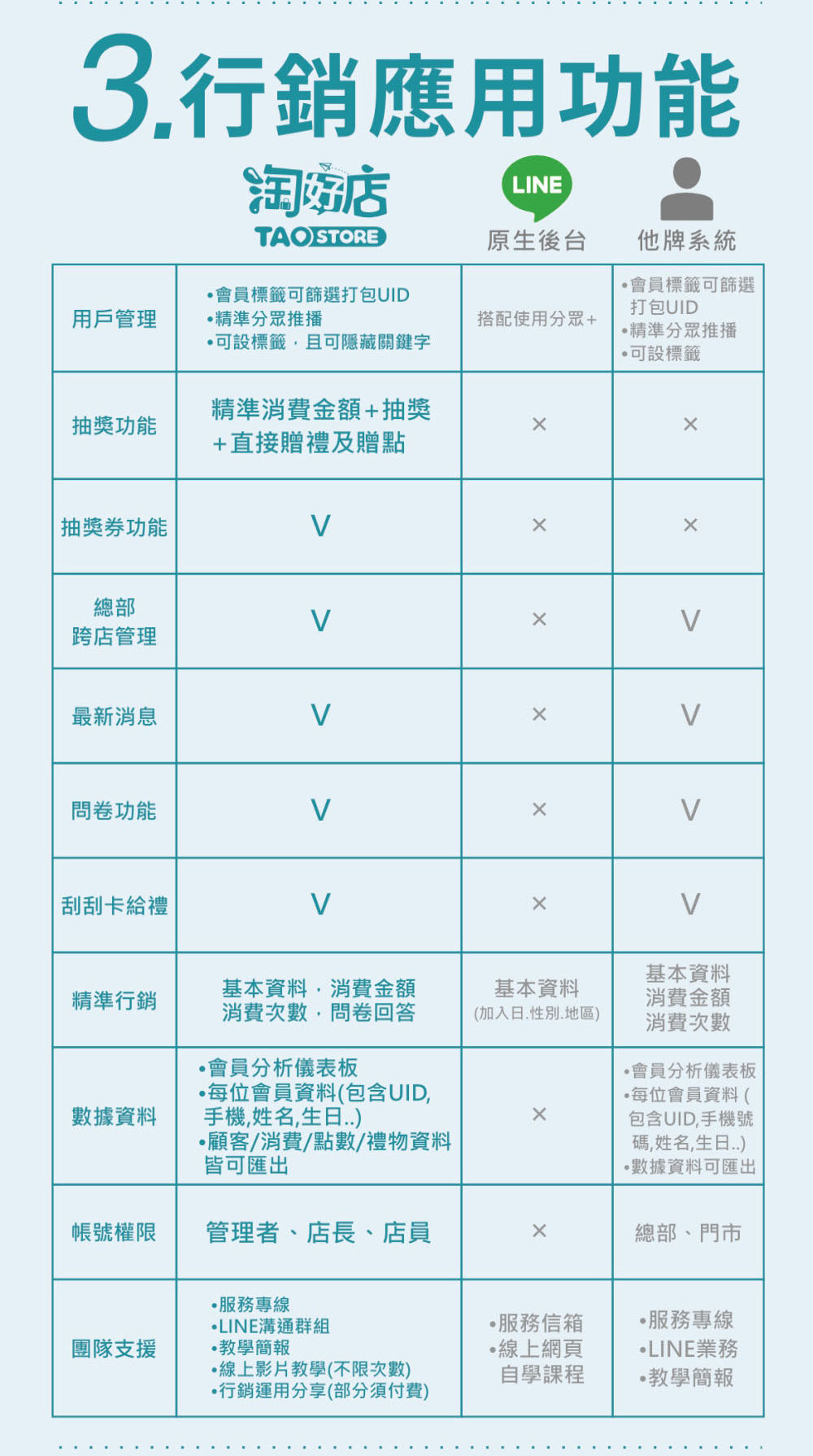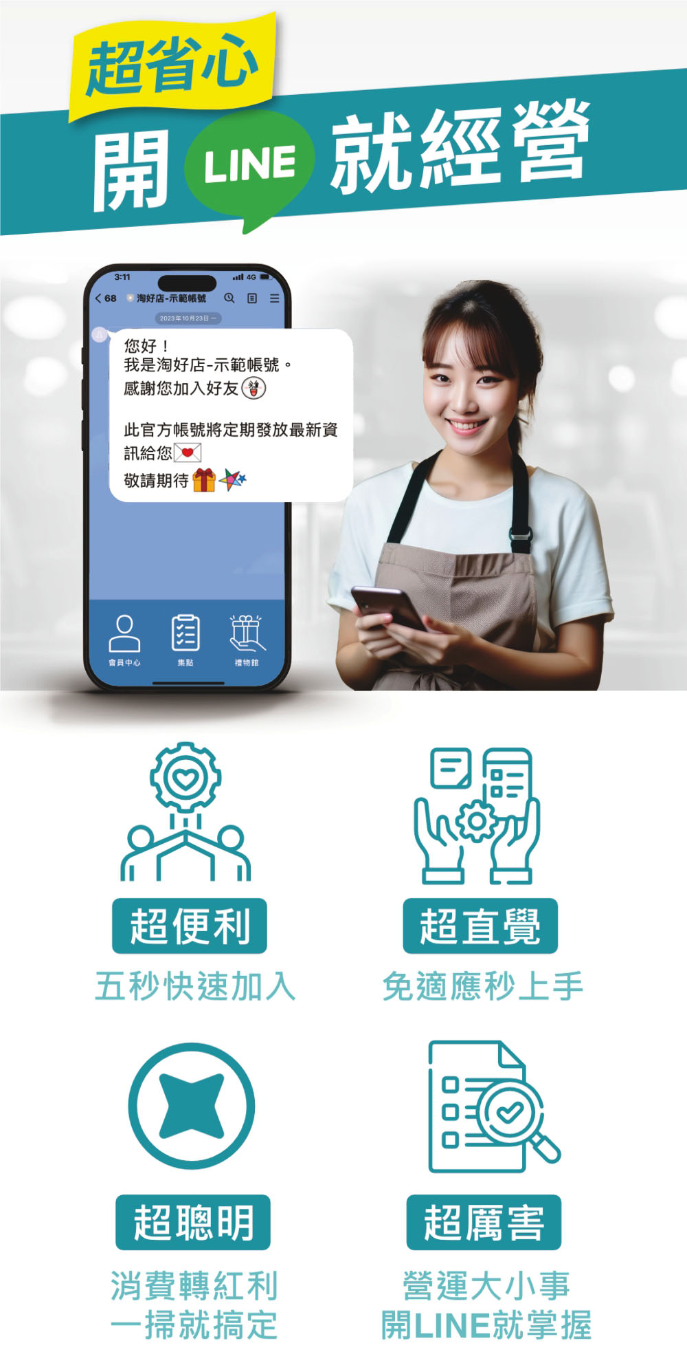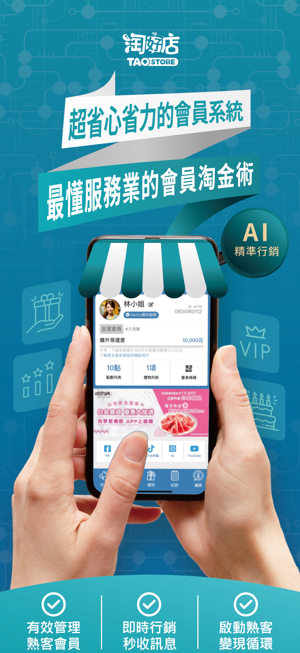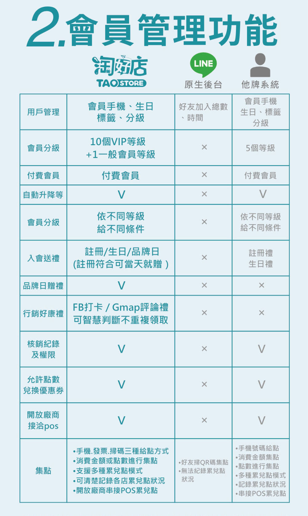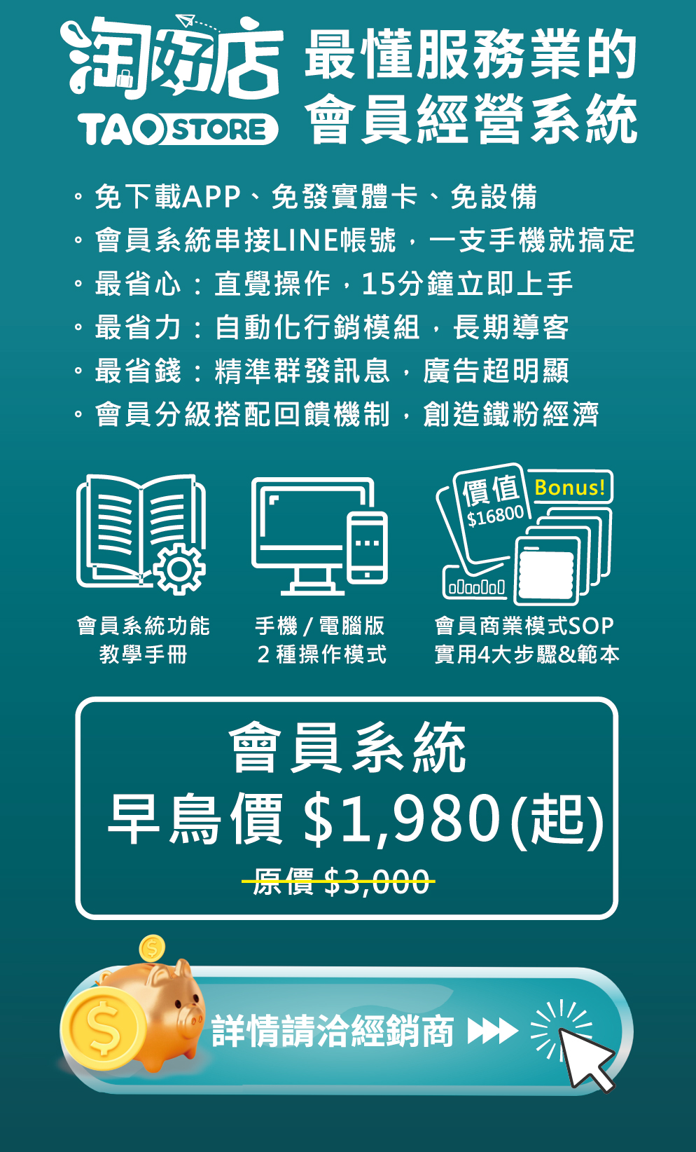 淘好店會員系統:串接LINE可直接管理,包括集點、禮物、生日等鼓勵會員互動。