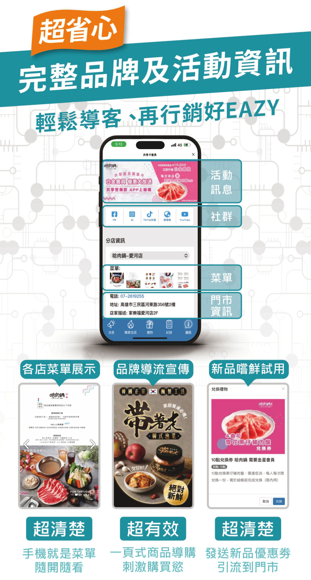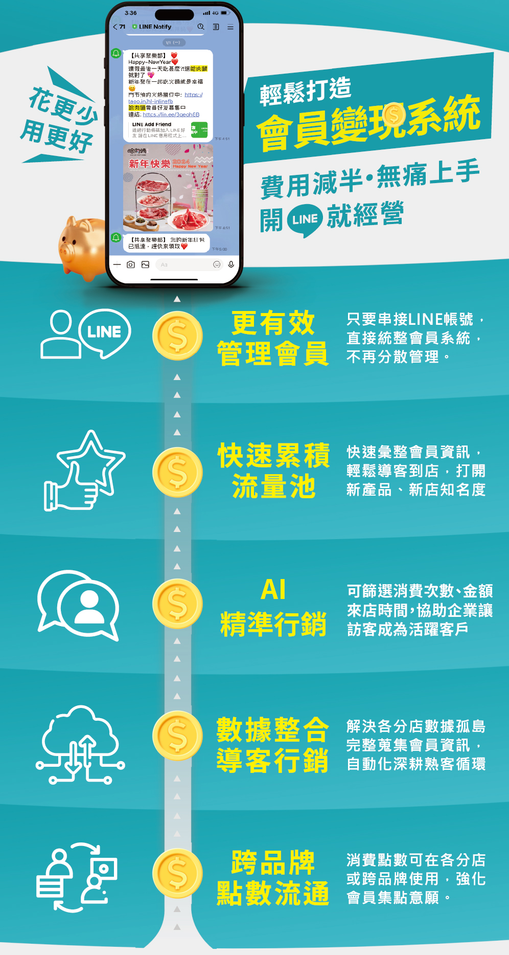 整合餐廳的消費資訊、會員資料、點數、禮物、優惠券等。方便店家管理顧客名單,並且可以做到精準地再行銷。